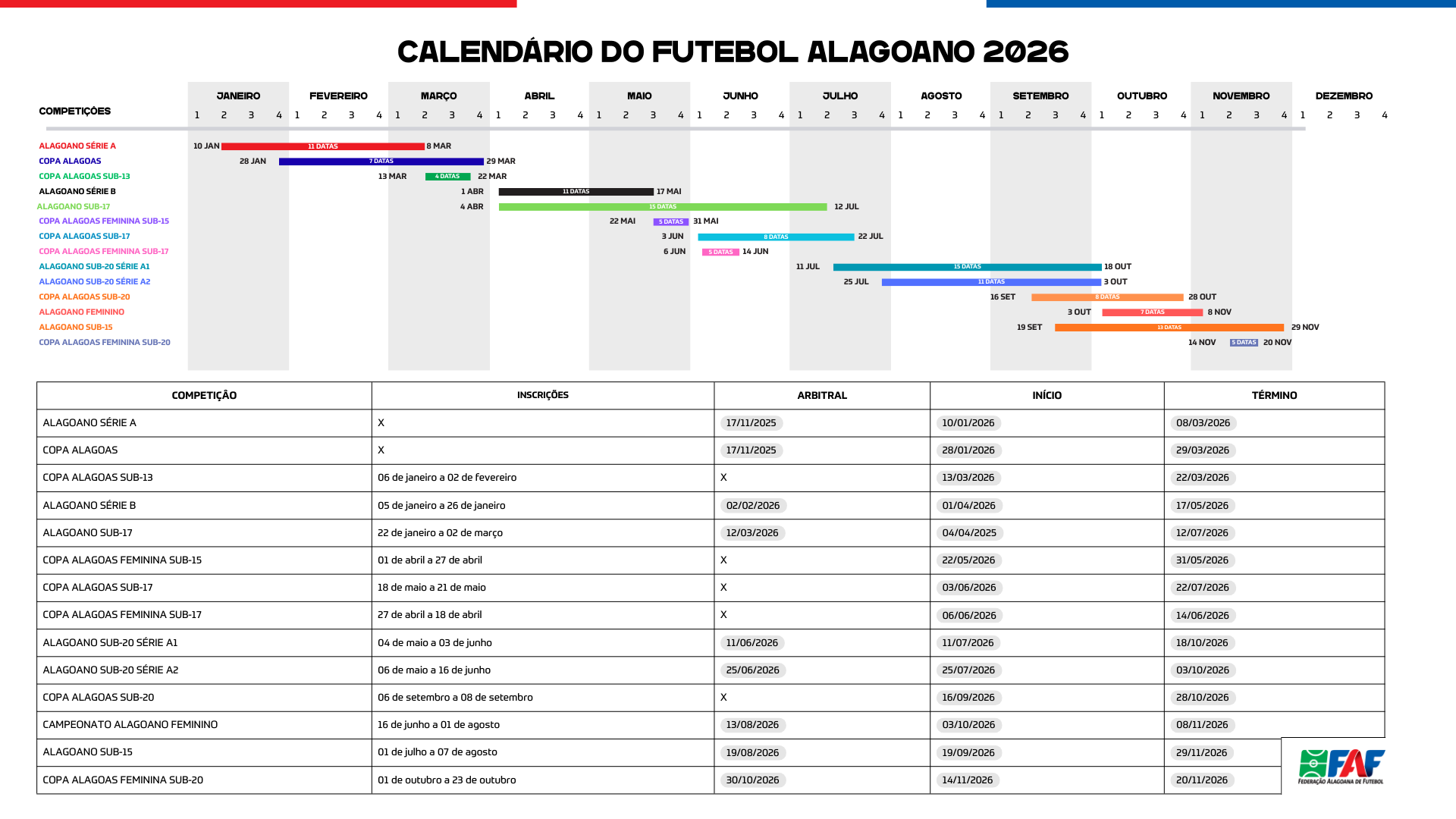 A Federação Alagoana de Futebol (FAF) publicou nesta segunda-feira (8), o calendário oficial do futebol alagoano para 2026, com datas já definidas para competições profissionais e categorias de base ao longo de todo o ano. A temporada começa em 10 de janeiro e vai até 29 de novembro, mantendo atividade praticamente contínua no futebol local.