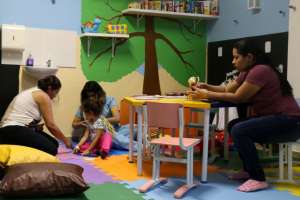 O espaço lúdico funciona no período da tarde, das 14 às 17 horas, com diversas atividades, a exemplo de pinturas, músicas, sala de tevê, contação de histórias e leitura com os pacientes.