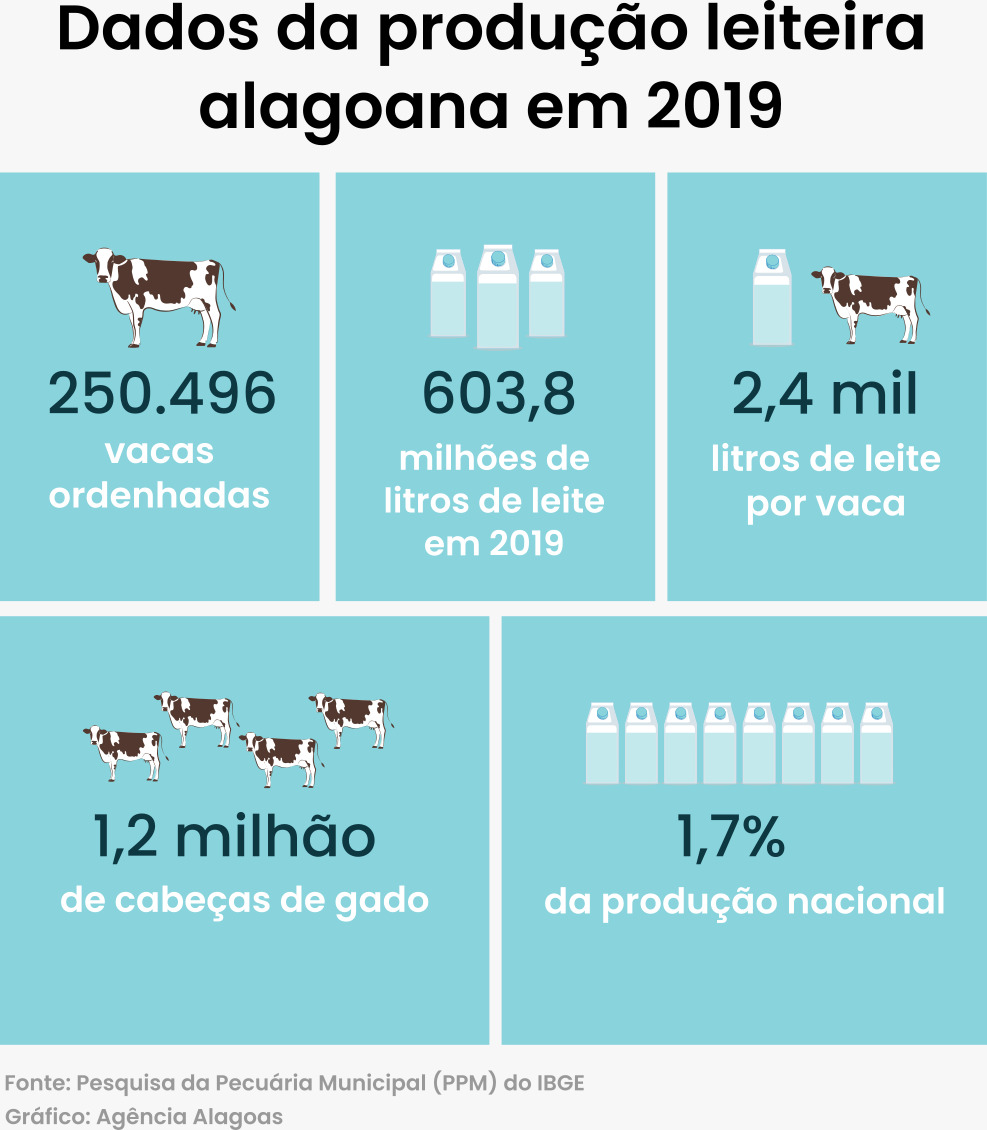 Com um rebanho de 250,5 mil vacas ordenhadas, Alagoas produziu um total de 603,8 milhões de litros de leite em 2019. Isso representa 2.410 litros por animal, fazendo com que o estado tenha a maior produtividade leiteira do Nordeste.