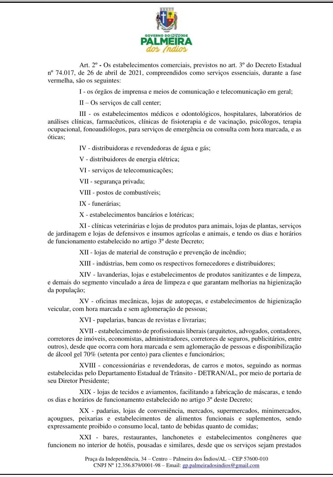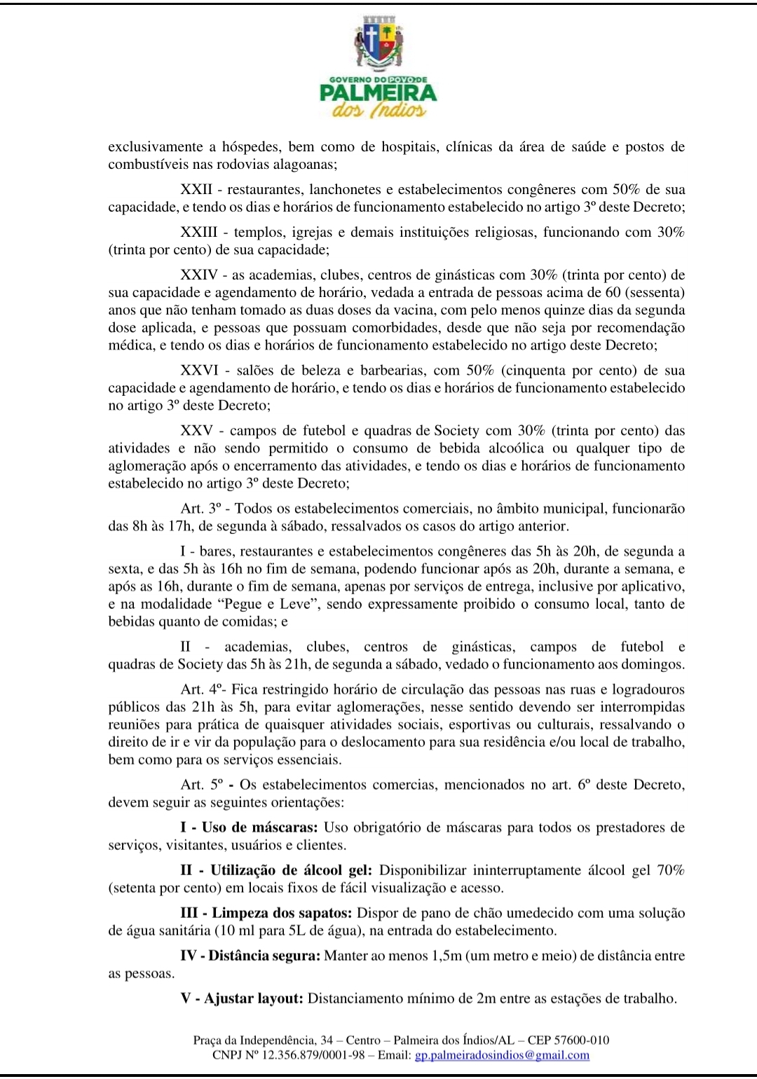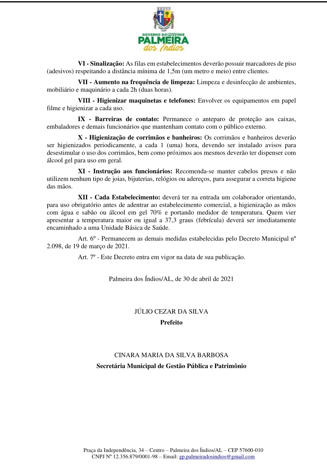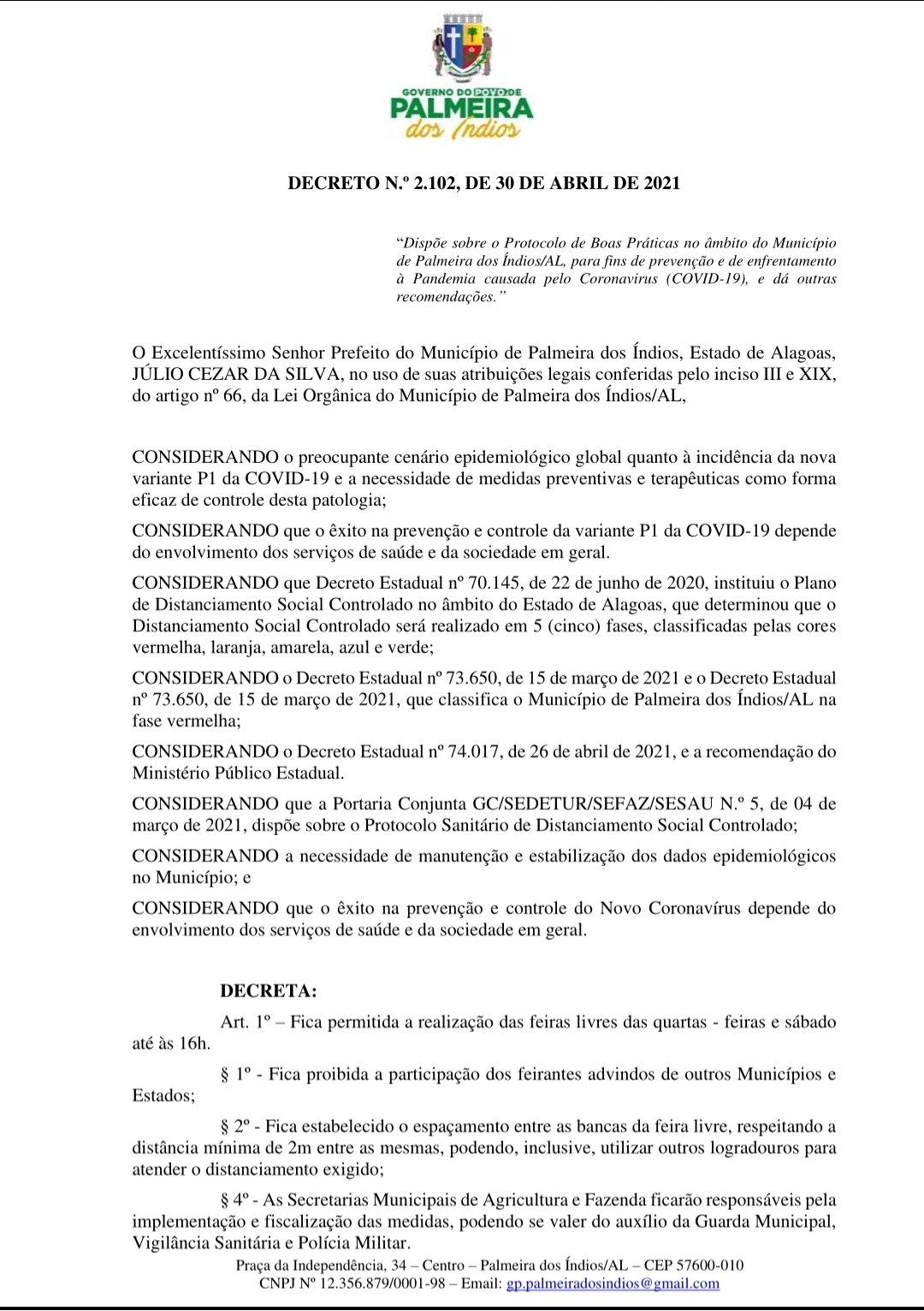 Também fica restringido o horário de circulação das pessoas nas ruas e logradouros públicos das 21h às 5h, para evitar aglomerações. Nesse sentido, devem ser interrompidas todas as reuniões de qualquer atividade social, esportiva ou cultural. “Mas ressalvando o direito de ir e vir das pessoas para o deslocamento de suas residências ou locais de trabalho, assim como os serviços essenciais. Pedimos à população que continue fazendo a sua parte, use álcool gel, máscaras de proteção, faça o distanciamento social e proteja a sua família. Vamos aguardar as etapas da vacinação, até que todo o município esteja vacinado. O vírus continua a fazer vítimas e perdemos muitas pessoas queridas. Lares foram destruídos por causa desta doença e todo cuidado é pouco. Vamos nos proteger e proteger a quem amamos”, alertou o prefeito Júlio Cezar.