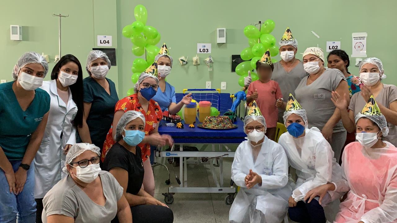 O menino completou seis anos e recebeu um bolo de aniversário e muito carinho da equipe de enfermagem e de nutrição do hospital.