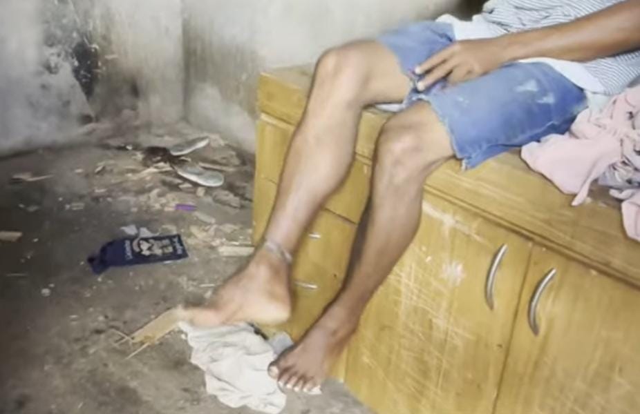 A cena é chocante. Dentro de um quarto escuro e degradado, com paredes sujas e o chão tomado por roupas velhas, restos de objetos e poeira, o homem aparece sentado sobre um móvel de madeira. Ele está cabisbaixo, de braços cruzados, usando bermuda jeans e camiseta simples. No pé direito, uma corrente com cadeado o mantém preso, impedindo qualquer tentativa de sair dali.