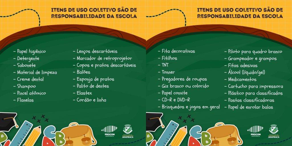 Para evitar abusos, o Procon Arapiraca divulgou uma lista contendo todos os itens que são de uso coletivo, cuja responsabilidade é da escola.