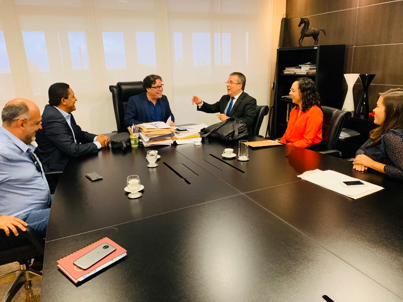 O prefeito Júlio Cezar se reuniu nesta quinta-feira (21), com o presidente do Tribunal de Justiça de Alagoas desembargador Tutmés Airan, em Maceió. Na pauta do encontro, foi discutido a realização de mais uma edição do Programa Moradia Legal, que acontecerá em breve em Palmeira dos Índios. O Moradia Legal, instituído pelo Poder Judiciário de Alagoas, em parceria com a Associação dos Notários e Registradores (Anoreg-AL) e as prefeituras de cada cidade, tem a função de simplificar a legalização de áreas urbanas ocupadas por pessoas de menor poder aquisitivo. A maior edição do Programa, em todo o estado, aconteceu em 2018, em Palmeira, com 1600 beneficiados. A reunião foi acompanhada pelo juiz da 1ª Vara de Palmeira dos Índios José Miranda Júnior, pela coordenadora de Habitação do município engenheira Francielly Soares, pelo controlador-geral Marcondes Oliveira e pela secretária de Administração Cinara Barbosa.